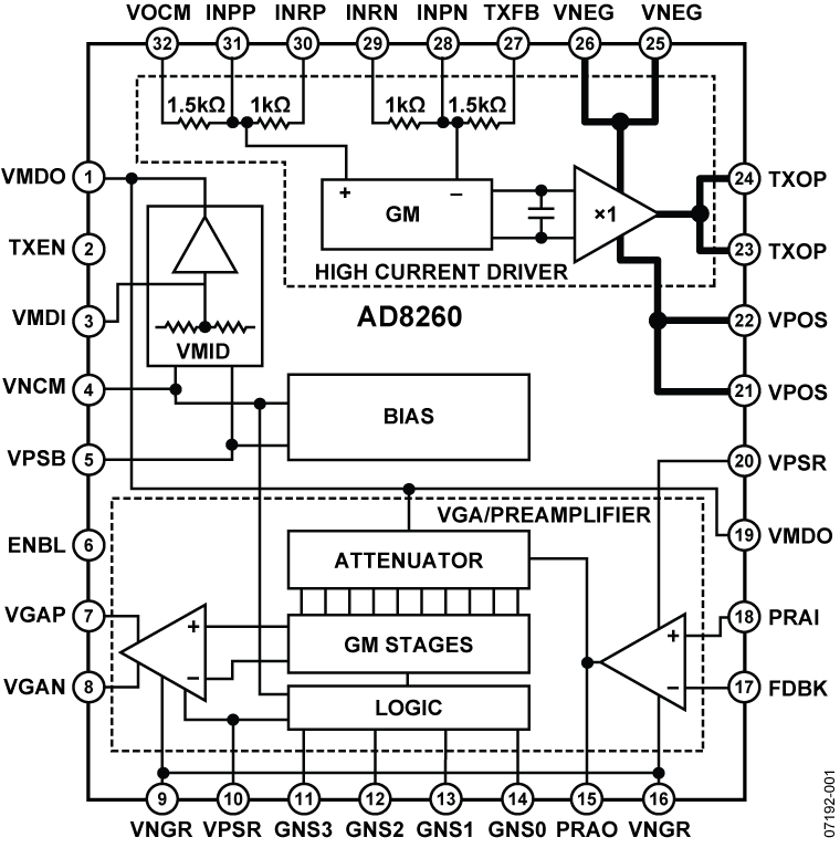 The AD8260 includes a high current driver, usable as a transmitter, and a low noise digitally programmable variable gain amplifier (DGA), useable as a receiver.
