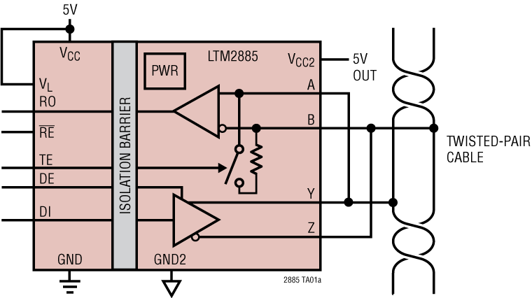 The LTM2885 is a complete galvanically isolated full-duplex RS485/RS422 μModule® (micromodule) transceiver. No external components are required. A single supply powers both sides of the interface through an integrated, isolated, low noise, efficient 5V output DC/DC converter.