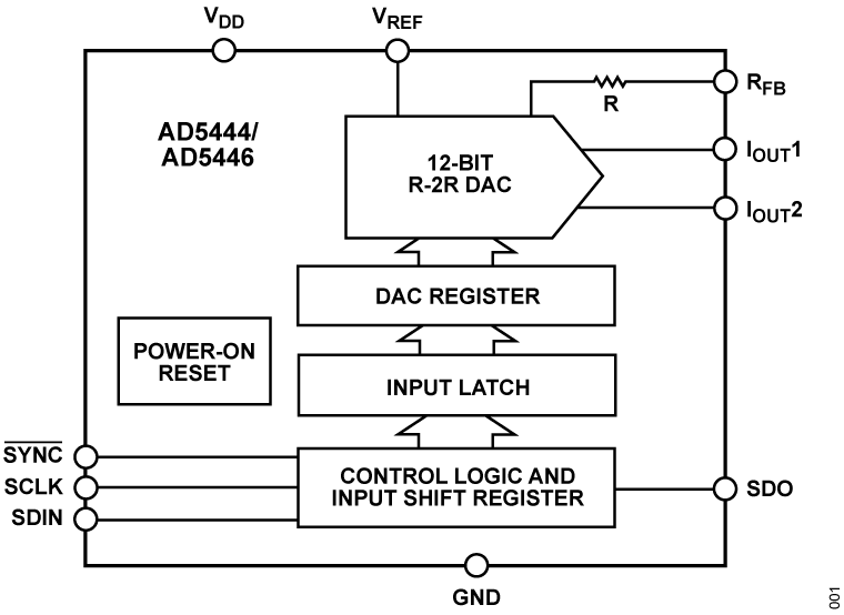 The applied external reference input voltage (VREF) determines the full-scale output current. These parts can handle ±10 V inputs on the reference, despite operating from a single-supply power supply of 2.5 V to 5.5 V. An integrated feedback resistor (RFB) provides temperature tracking and full-scale voltage output when combined with an external current-to-voltage precision amplifier. The AD5444 / AD5446 DACs are available in small 10-lead MSOP packages, which are pin-compatible with the AD5425 / AD5426 / AD5432 / AD5443 family of DACs.
