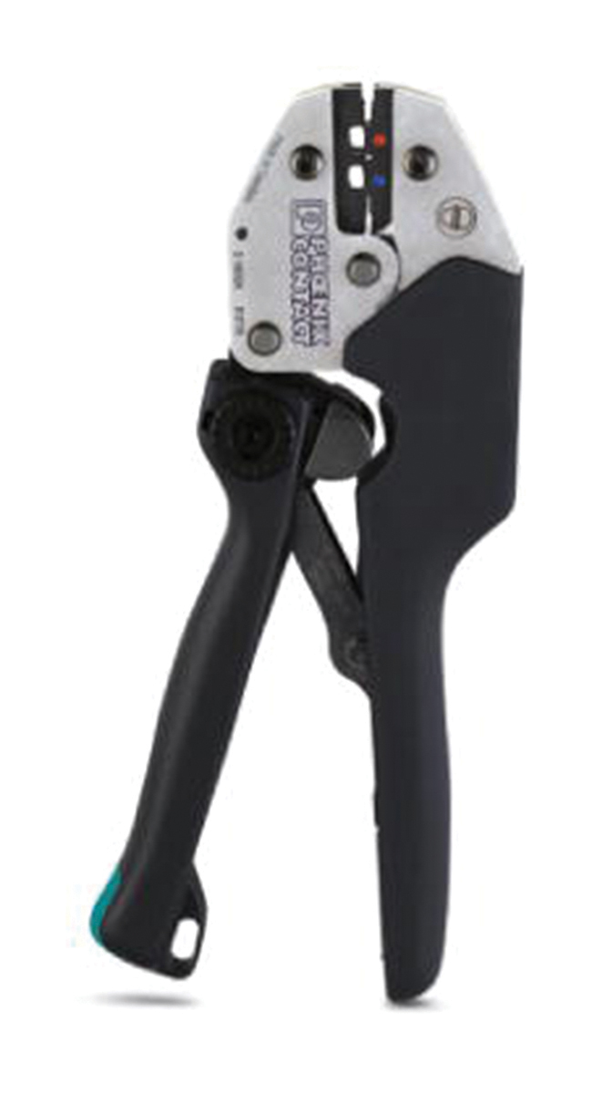 Szczypce do zaciskania, szczypce kompaktowe, do izolowanych końcówek kablowych (czerwony, niebieski), dwie oznaczone stacje tłokowe, odblokowująca blokada ciśnieniowa, wejście boczne
