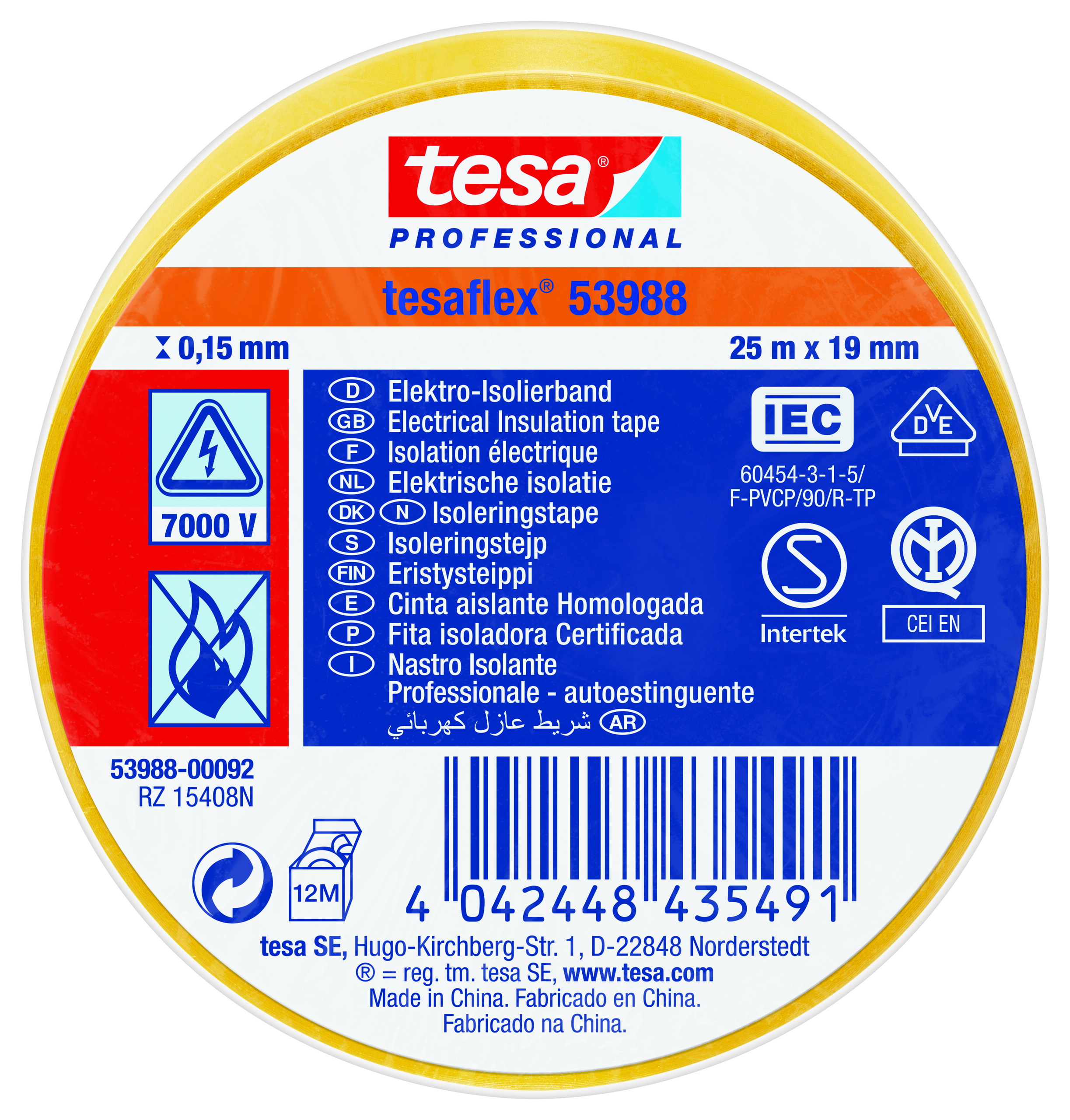 Taśma izolacyjna Żółty szerokość: 19mm grubość: 150mm długość: 25m Miękki PVC 7000V Tesa
