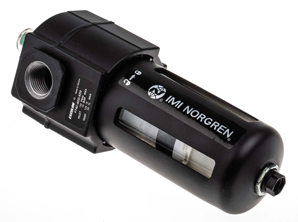 Norgren Excelon - wysokosprawne filtry do usuwania oleju. Element koalescencyjny przekształca mgłę oleju i wody w ciecz, którą można następnie spuścić.