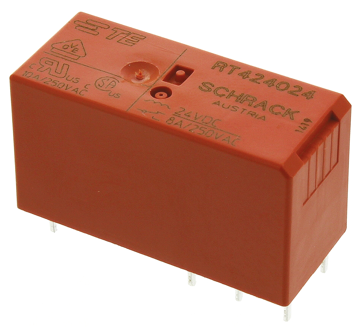 Przekaźnik bezzatrzaskowy serii te Connectivity RT2 do montażu na płytce drukowanej ma konfigurację styków DPDT.