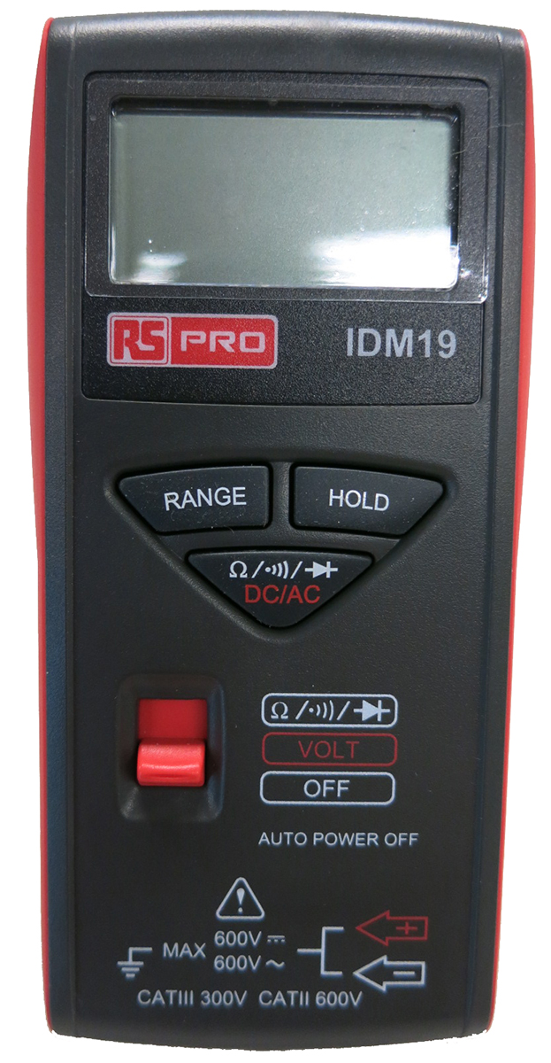 Kieszonkowy cyfrowy multimetr RS PRO IDM19 przeznaczony do rozwiązywania problemów elektrycznych i elektronicznych oraz do pomiaru wartości, takich jak napięcie, oporność i tester do testowania diody i ciągłości.