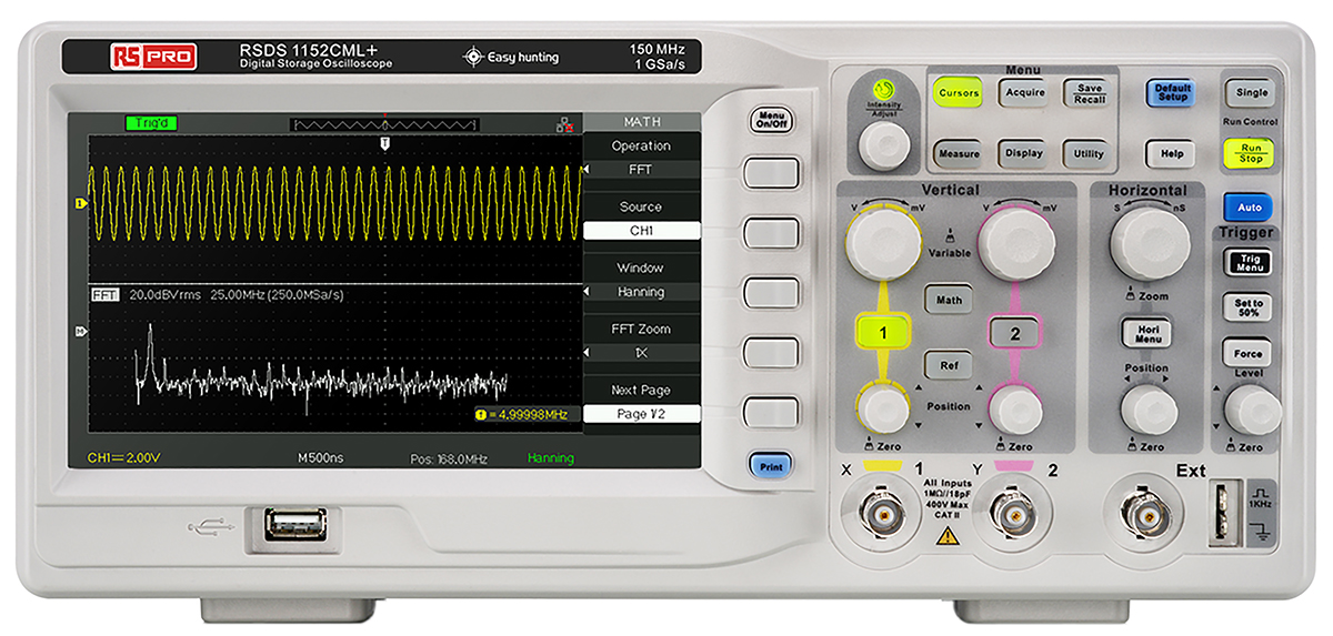 RS Pro RSDS1000CML+/DL+ Series to dwukanałowy uniwersalny oscyloskop cyfrowy dostępny w modelach o szerokości pasma 50 MHz, 70 MHz, 100 MHz i 150 MHz.