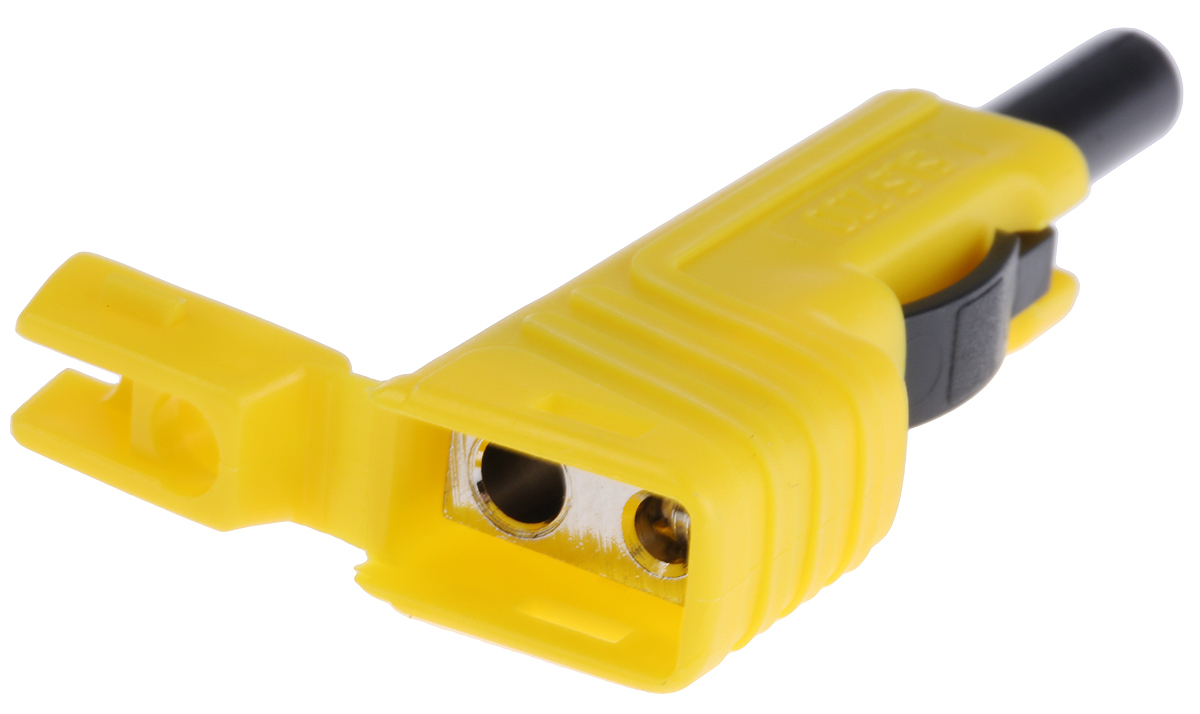 Hirschmann Test i pomiar 4-milimetrowej części wtykowej banany serii SLS 200 z wkrętami z zabezpieczeniem dotykowym, zatyczkami chowanymi 4 mm, które można łączyć tylko pod wpływem nacisku na boczną sprężynę blokującą.