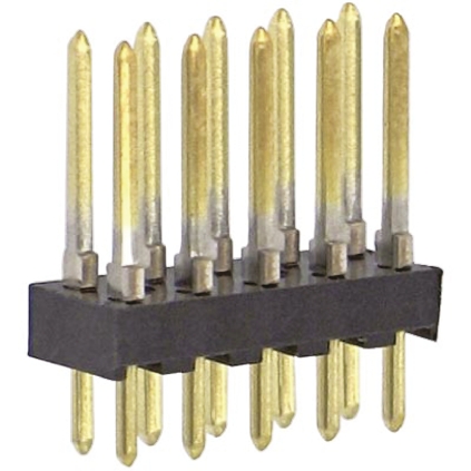 Szereg złączy TE AMPMODU II 2,54 mm z osłoniętymi dwurzędowymi głowicami czołowymi standardowymi z podwójnym rzędem, o wysokości płyty 10,36 mm (0,408 cala) i długości lutowanej 3,18 mm (0,125 cala).