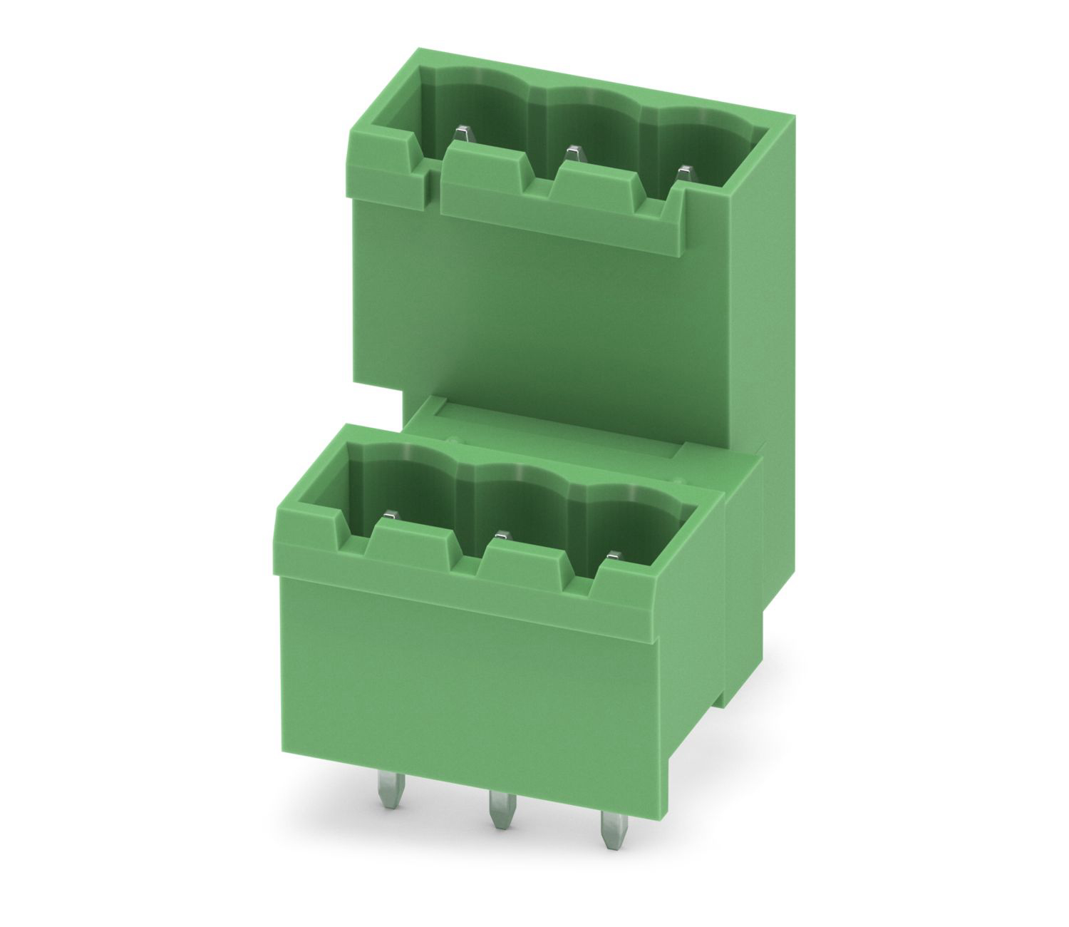 Złącza PCB, przekrój nominalny: 2.5 mm², kolor: Zielony, prąd nominalny: 10 A, napięcie znamionowe (III/2): 320 V, powierzchnia styku: Cyna, typ styku: Złącze męskie, liczba potencjałów: 6, liczba rzędów: 2, Liczba pozycji w rzędzie: 3, liczba połączeń: 6, zakres produktu: MDSTBVA 2,5/.