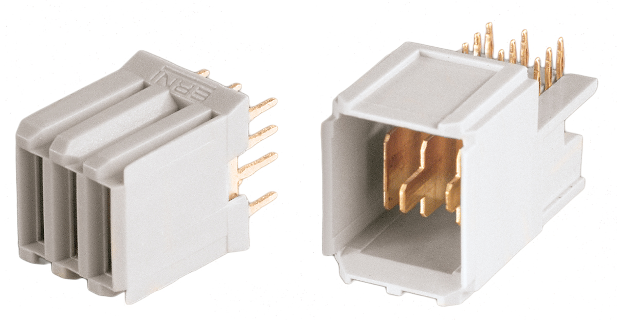 Z ERNI Electronics, serii złączy zasilania płyty montażowej. Te męskie, kątowe moduły zasilania spełniają wymogi ERmet 2,0 mm zakresu.