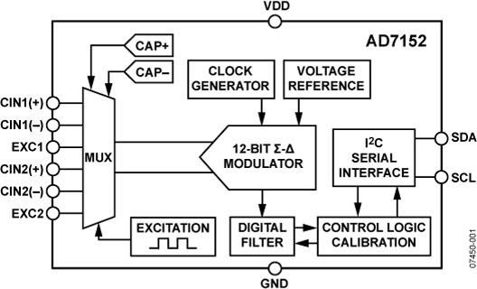 The AD7153 has one capacitance input channel, while the AD7152 has two channels. Each channel can be configured as single-ended or differential. The AD7152 / AD7153 are designed for floating capacitive sensors.