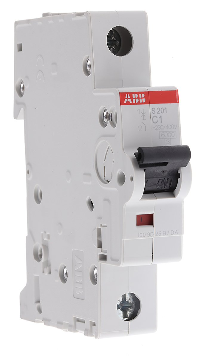 Wyłącznik nadprądowy MCB, Typ C, 1-biegunowy, 1A, 230V, 72V, na szynę DIN, ABB S201-C1, S200