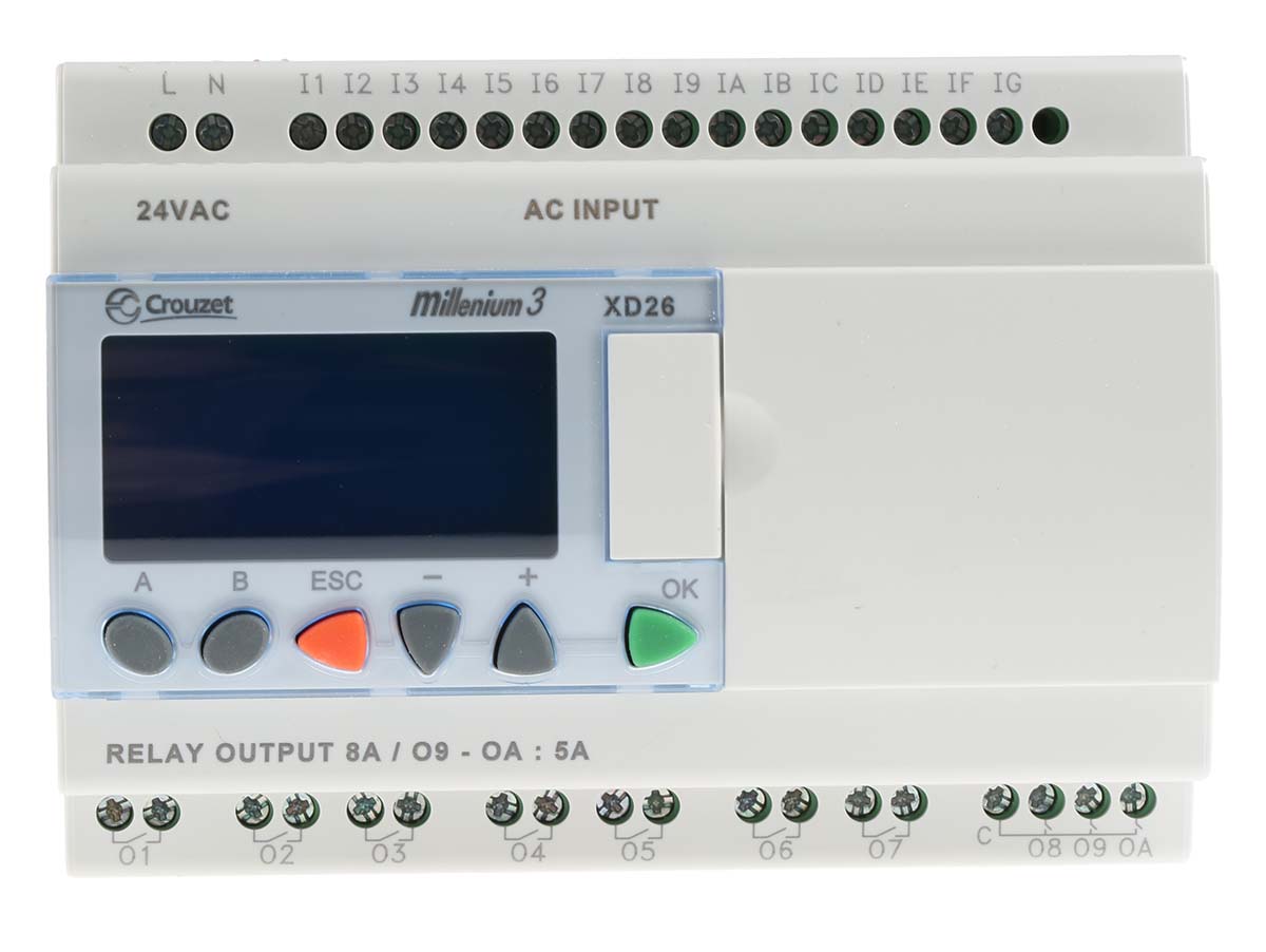 Moduł logiczny Crouzet Millenium 3 to najnowsza generacja modułów rozszerzalnych serii XD26 z 16 wejściami cyfrowymi i 10 wyjściami przekaźnikowymi 8 x 8 A oraz 2 x 5 A obciążnikami przekaźnikowymi.
