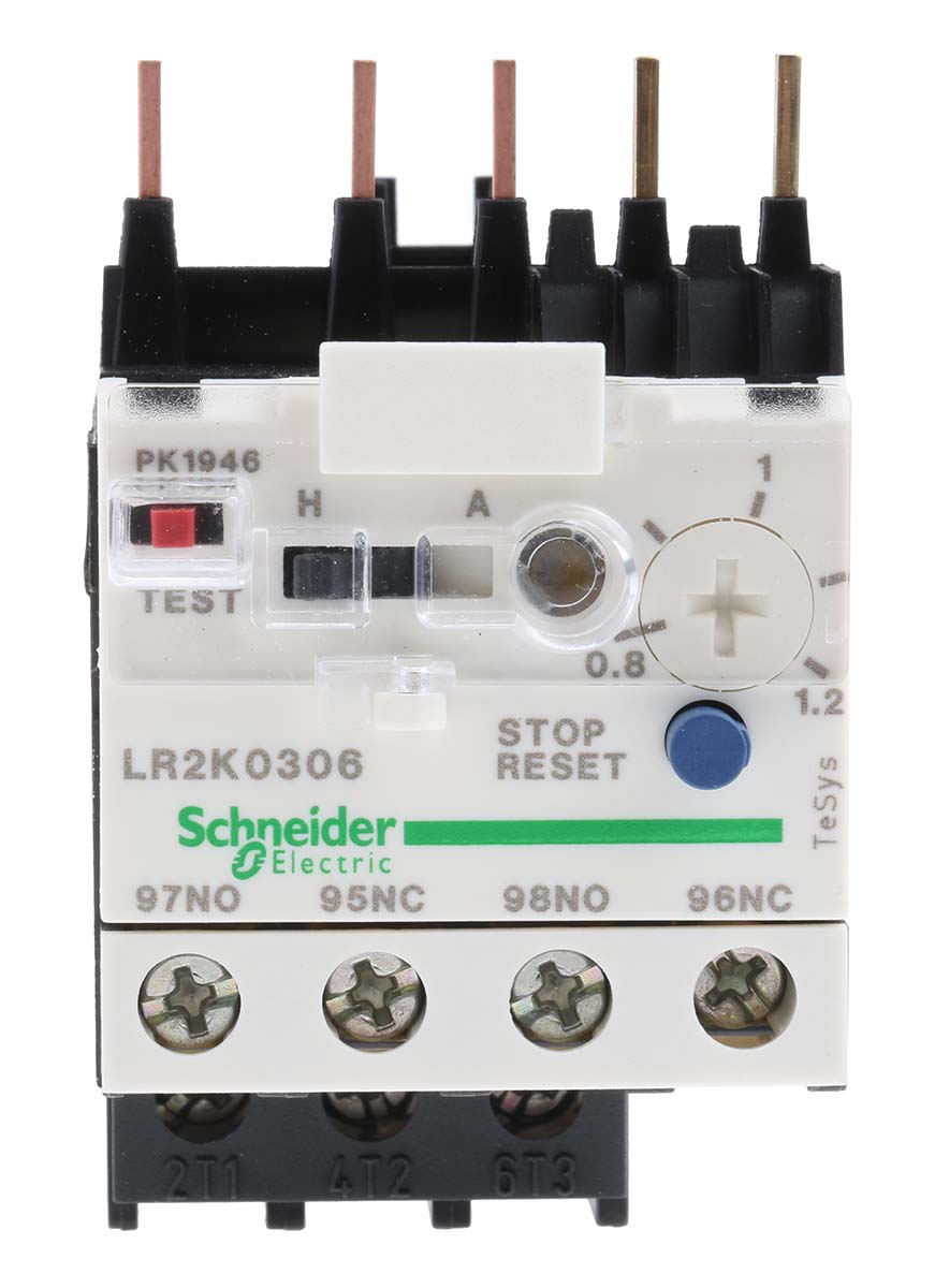 Ten termiczny przekaźnik przeciążeniowy firmy Schneider Electric jest przeznaczony do ochrony silników przed przegrzaniem i uszkodzeniem, z napięciem znamionowym styku 690 V AC i prądem znamionowym silnika 1,2 A.