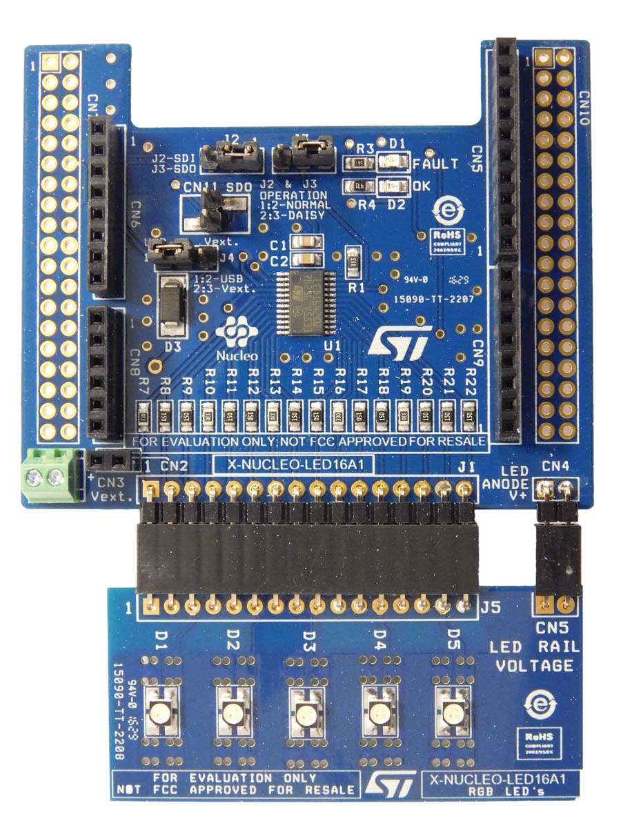 X-NUCLEO-LED16A1 jest płytą rozszerzenia STM32 Nucleo zaprojektowaną w celu zapewnienia platformy ewaluacyjnej dla 16-kanałowego sterownika LED LED LED LED LED LED LED LED o mocy 13642GW.