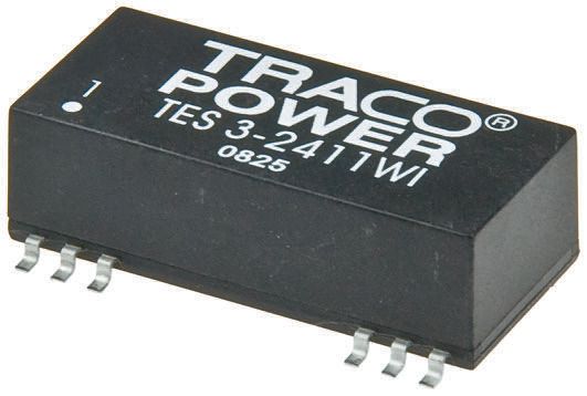 Jednopłytowy/dwuwyjściowy, 3-watowy, regulowany wyizolowany, wysokowydajny konwerter DC-DC z kompaktowym, niskoprofilowym pakietem SMD i szerokim zakresem napięcia wejściowego 4:1.