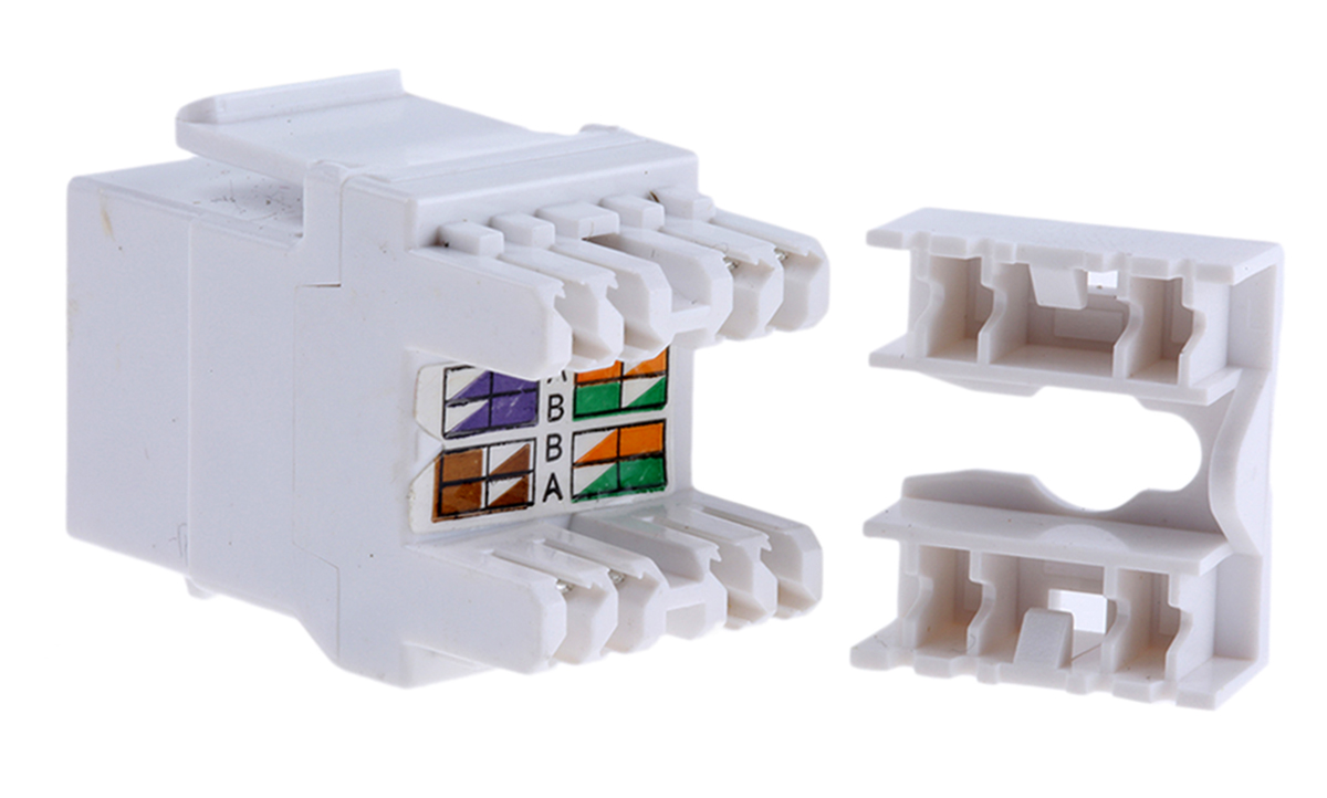 Szereg gniazd RJ45 przeznaczonych do paneli połączeniowych w Wielkiej Brytanii i Europie. Nieekranowane gniazdo Keystone z parą skręconą (UTP) kategorii 5e przeznaczone do montażu w płytach ściennych europejskich i brytyjskich lub panelach łączących o rozmiarze RJ45.