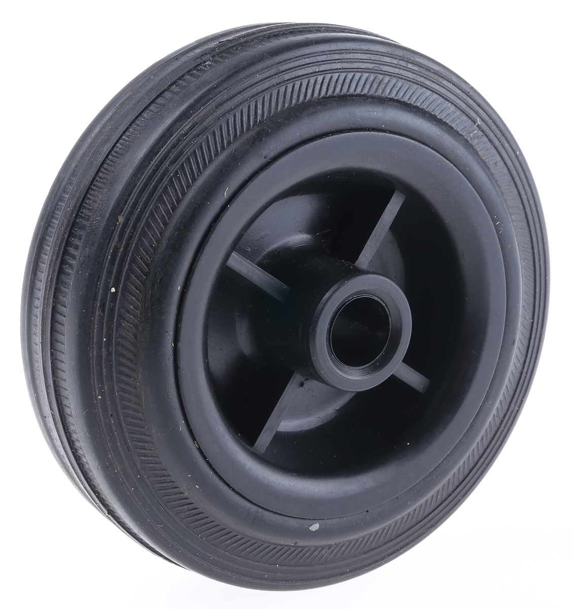 Czarne, polipropylenowe koła z kopolimerem ze standardową, czarną gumą z profilem trapezoidalnym. Symetryczna piasta z gładkim otworem lub łożyskami wałeczkowymi.