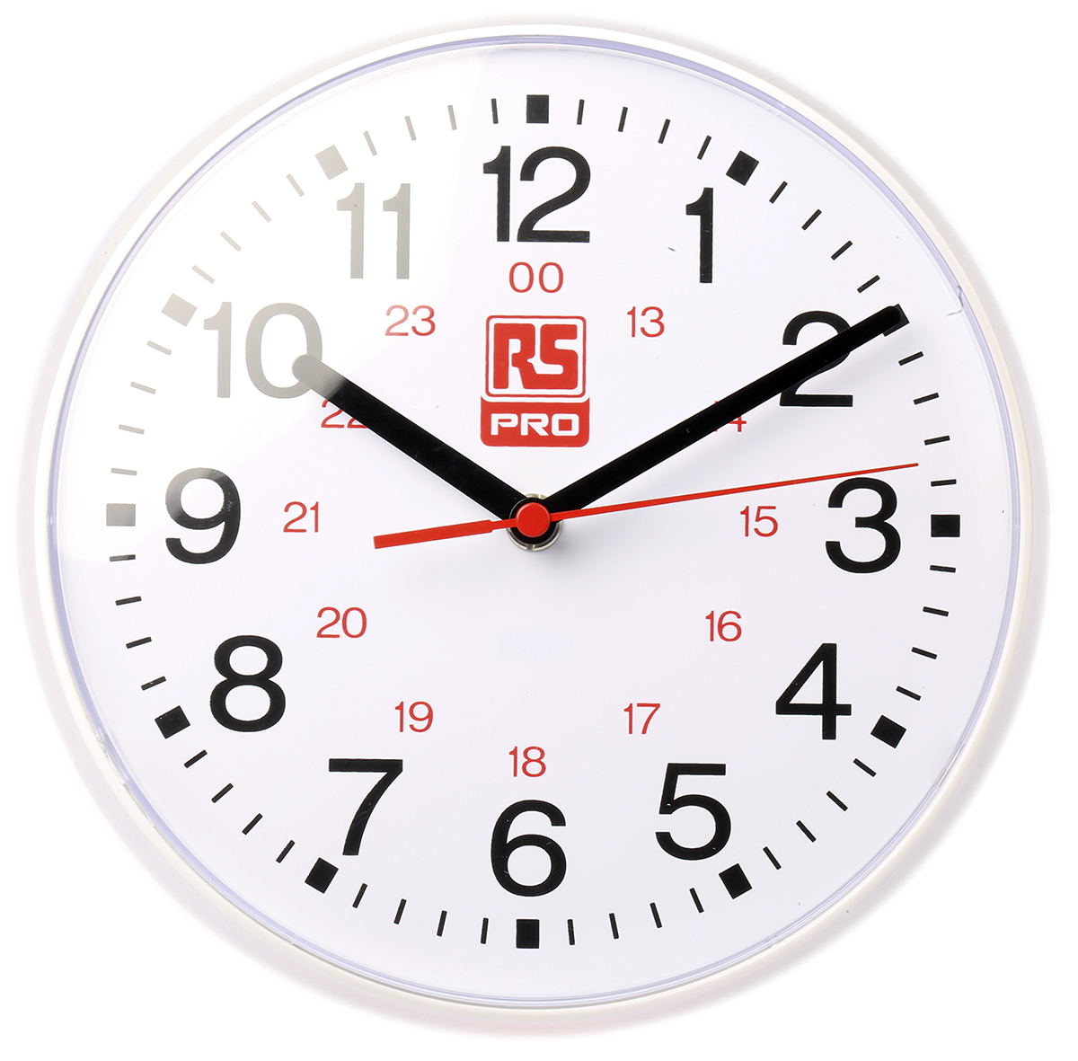Przedstawiamy analogowy zegar ścienny RS Pro z białym pokrętłem, 12 arabskimi oznaczeniami i minutę wydrukowanego na czarno.