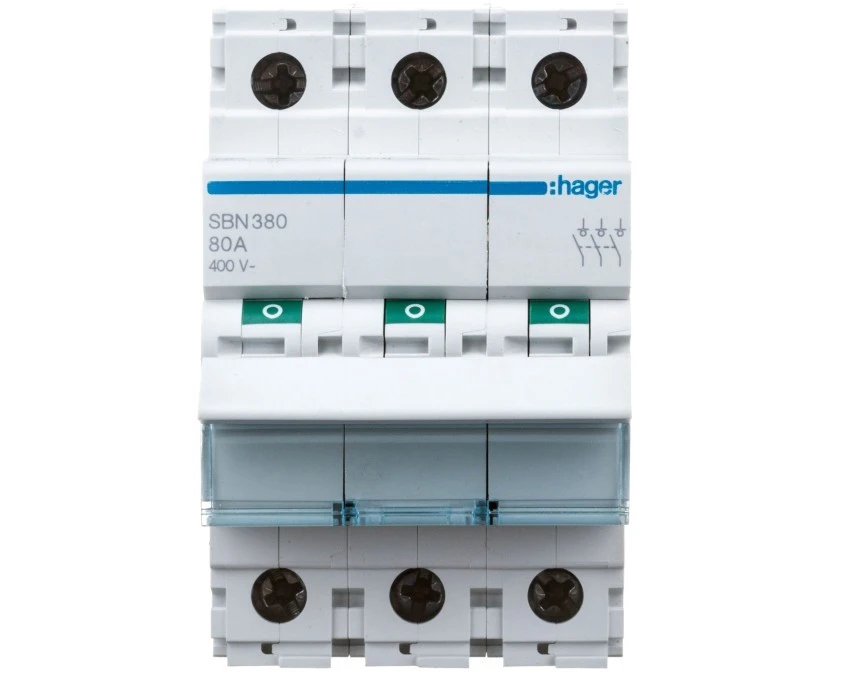 3. Rozłącznik izolacyjny 3-fazowy 3P 80A 400V AC SBN380 HAGER 100.49