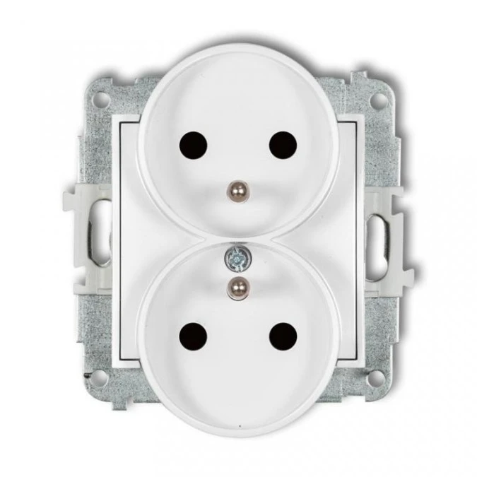 1. MINI Mechanizm gniazda podwójnego do ramki bez uziemienia 2x2P (bez przesłon torów prądowych) biały mat 25MGPR-2 KARLIK 20.26