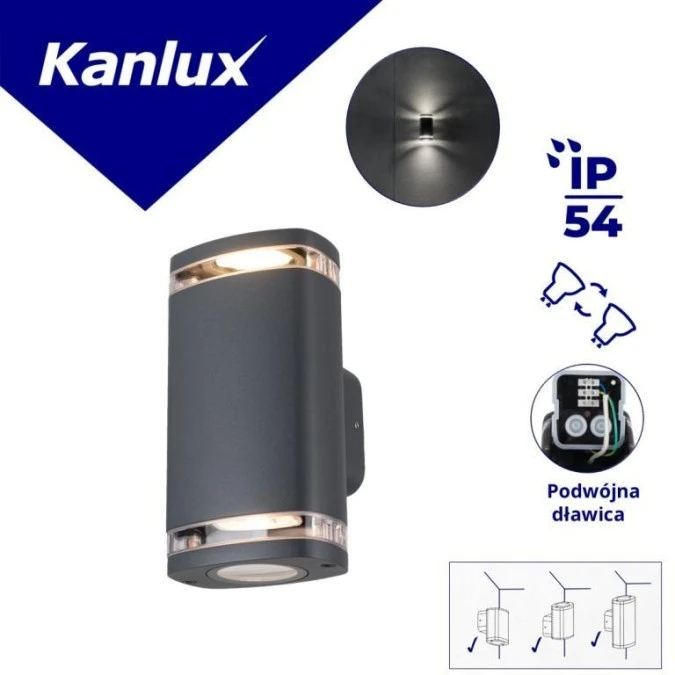 7. Oprawa elewacyjna ZEVI EL 2GU10 G 2xmax 10W IP54 podwójny dławik kinkiet szary 38883 55.28