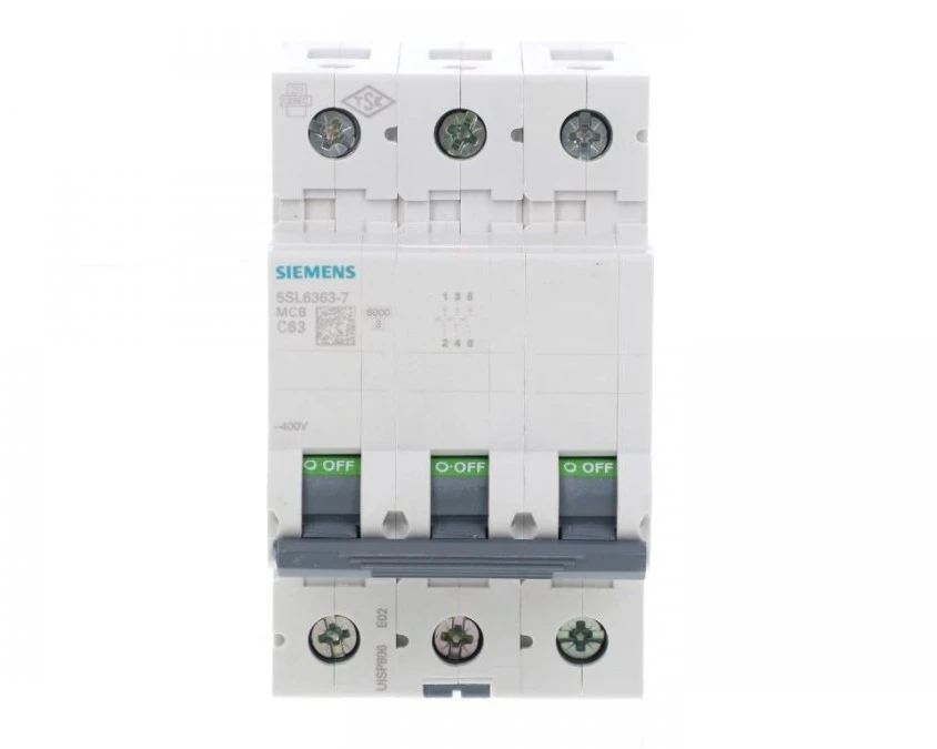 6. Wyłącznik nadprądowy MCB, Typ C, 3-biegunowy, 63A, 400V, 72V, na szynę DIN, Siemens 5SL6363-7, 5SL6 1442.31