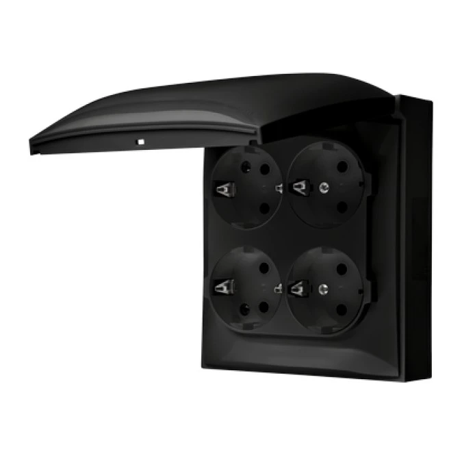 11. SIMON AQUACLICK Gniazdo poczwórne z uziemieniem SCHUKO klapka w kolorze szybkozłącza IP44 czarny ACGSZ4C/49 KONTAKT SIMON 74.24