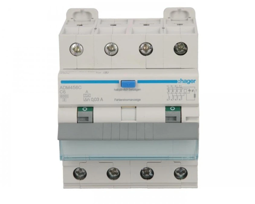 1. Wyłącznik różnicowoprądowy z członem nadprądowym C 6A 3P+N 6kA 30mA typ A ADM456C HAGER 828.79
