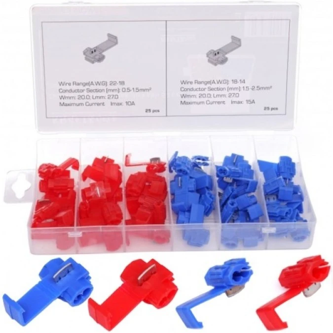 Zestaw szybkozłączek odgałęźnych typ B (1,5-2,5mm2) niebieska + typ R (0,5-1,5mm2) czerwona Kraft&Dele 50szt w pudełku
