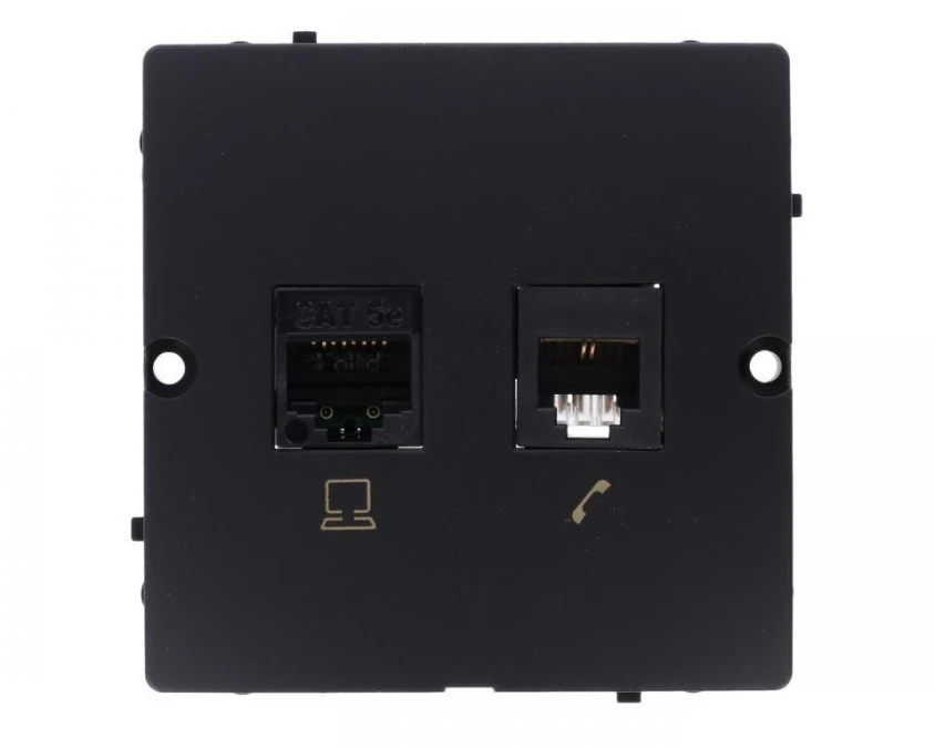 Simon Basic Gniazdo komputerowe RJ45 kat.5e + telefoniczne RJ11 (moduł). Montaż gniazda na wkręty do puszki czarny BMF5T.02/49