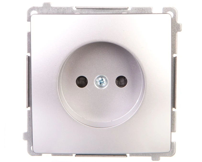 12. Simon Basic Gniazdo pojedyncze b/u z przesłonami torów prądowych 16A 250V srebrny mat BMG1z.01/43 25.45