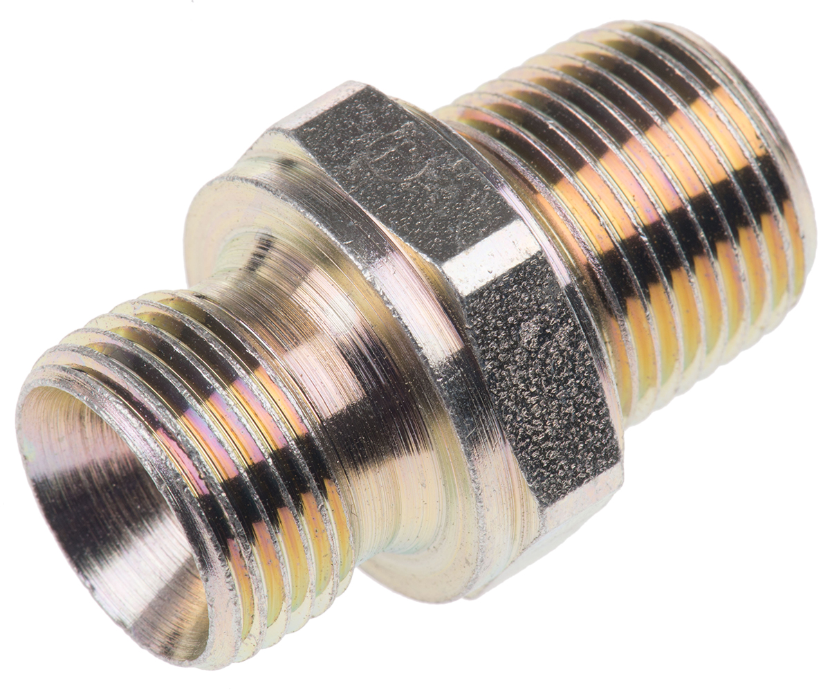 Hydrauliczny adapter gwintowany prosty, Złacze A: G 1/2, Złacze B: R 3/8 męskie, Stal, 200bar