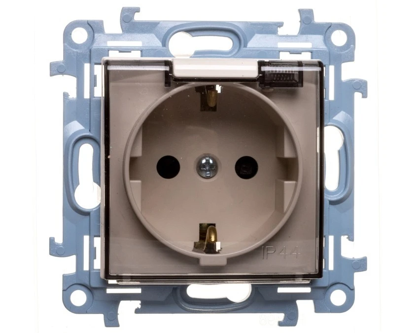 SIMON 10 Gniazdo pojedyncze z uziemieniem schuko do wersji IP44 z uszczelką z przesłonami torów prądowych klapka transparetna po