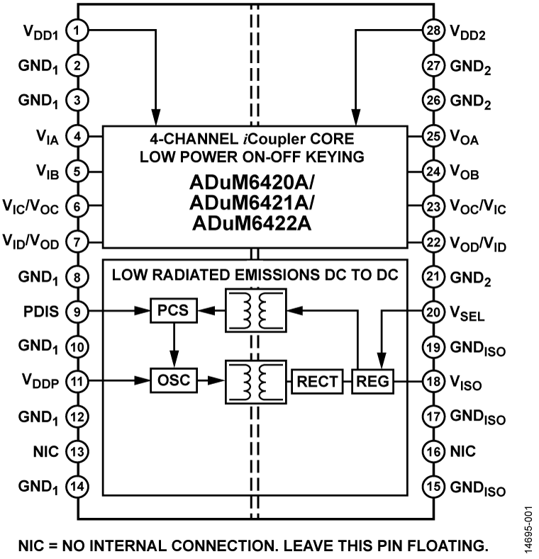 ADUM6420A - Quad-Channel Isolators with Integrated DC-to-DC Converter (4:0 directionality)