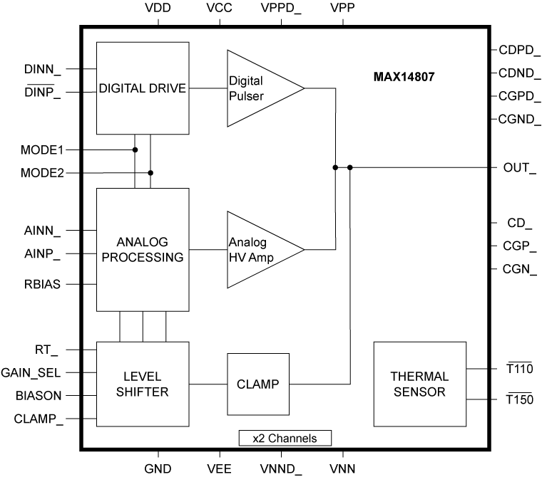 The MAX14807 dual, high-voltage (HV) 2.2A analog ...
