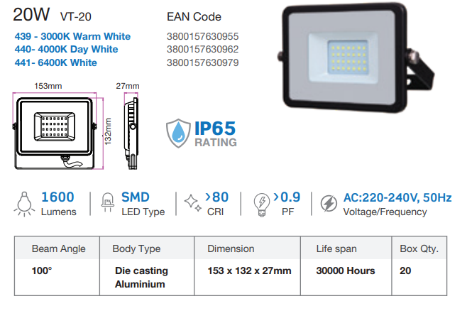 5. Naświetlacz LED SMD 20W 1620lm 6500K IP65 czarny barwa CW biała zimna VT-4021 V-TAC 18.33