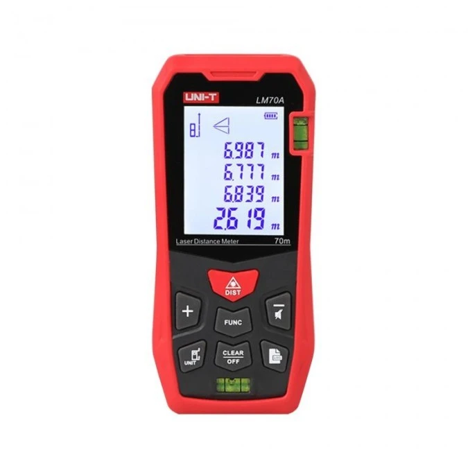 Dalmierz laserowy Uni-T pomiar: pojedynczy, ciągły, powierzchni, objętności, twierdzenie Pitagorasa LM-70A 70m