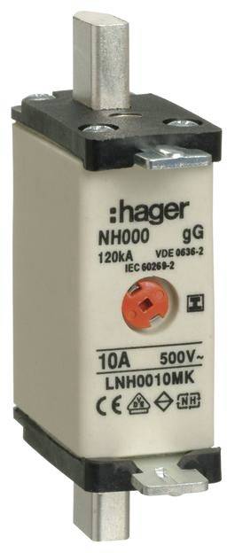 Wkładka bezpiecznikowa nożowa NH000 wskaźnik podwójny uchwyt izolowany gG 10A 500VAC LNH0010MK HAGER