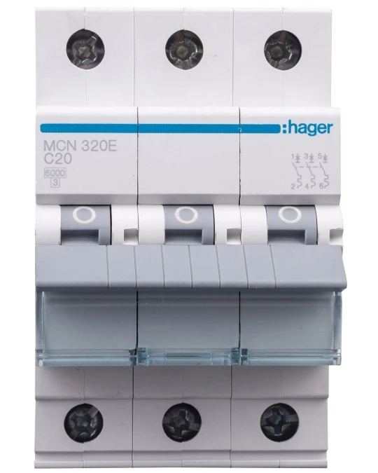 2. Wyłącznik nadprądowy 6kA , C, 20A, 3P, C20 Hager MCN320E 68.39