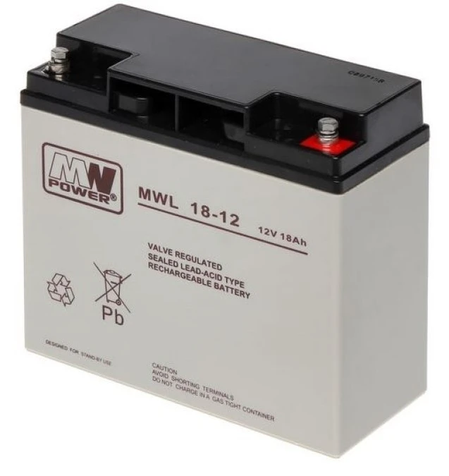 Akumulator; kwasowy bezobsługowy AGM; MWL 18-12; 12V; 18Ah; 181x77x167mm; śruba M5; MW POWER; 5,5kg; 10÷12 lat