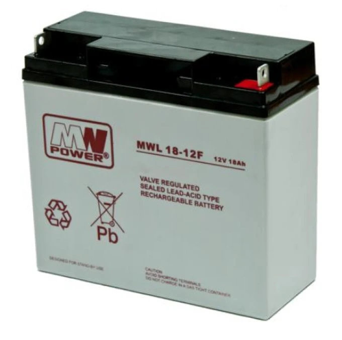 Akumulator; kwasowy bezobsługowy AGM; MWL 18-12F; 12V; 18Ah; 181x77x167mm; śruba M5; MW POWER; 5,5kg; 10÷12 lat