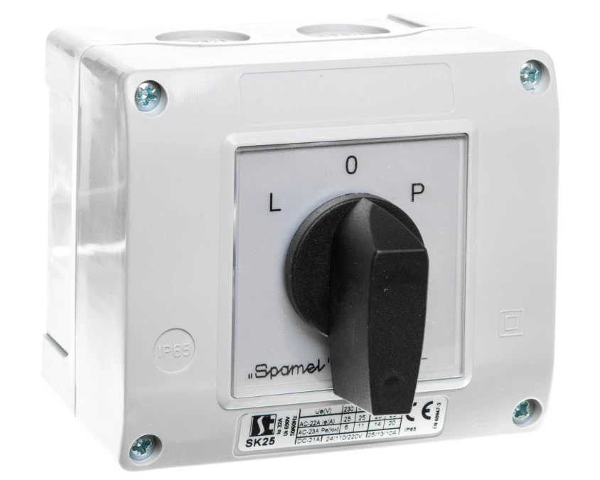 SK25-2.8210\OB13ZC Łącznik krzywkowy 25A, Rozłącznik 0-1 (45st), 4-biegunowy, w obudowie, czoło żółto-czerwone, IP65