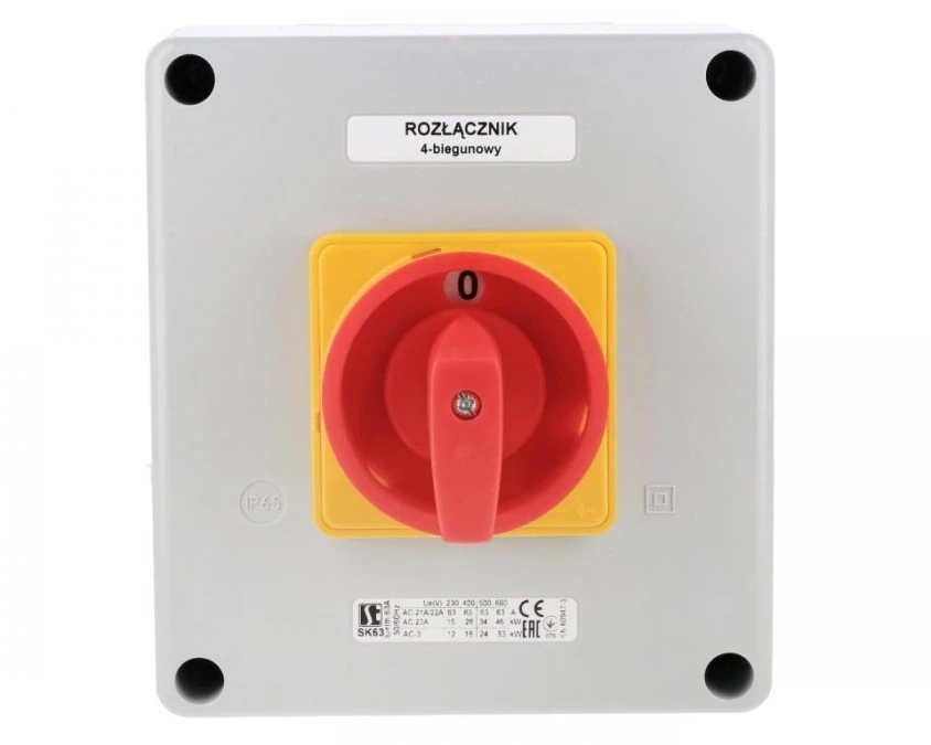Łącznik krzywkowy 63A rozłącznik 0-1 (4 - biegunowy)w obudowie OB16 z czołem zamykanym żółto/czerwonym SK63-2.8210\OB16ZC