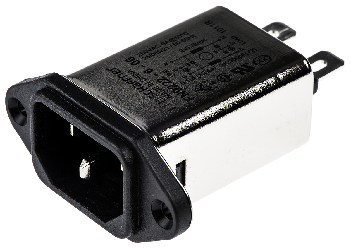 6. Gniazdo zasilające IEC z filtrem przeciwzakłóceniowymNone 6A C14 Schaffner Montaż na panelu 25.25 x120