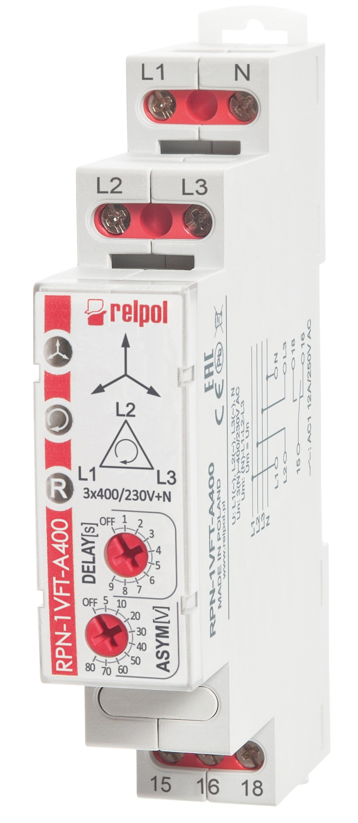 6. Przekaźnik do nadzoru napięcia AC w sieci 3-fazowej 3 (N) - 400/230 V wyjście - 1 zestyk przełączny napięcie znamionowe 3(N) RPN 125.62