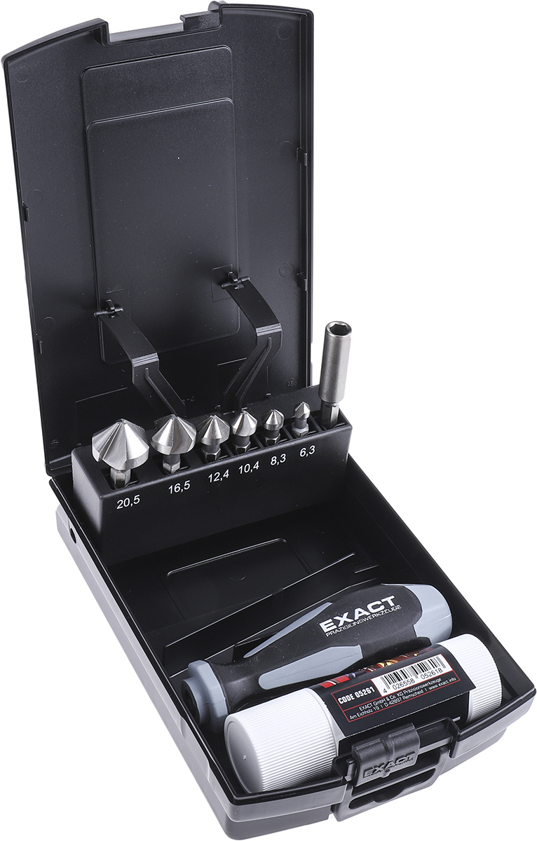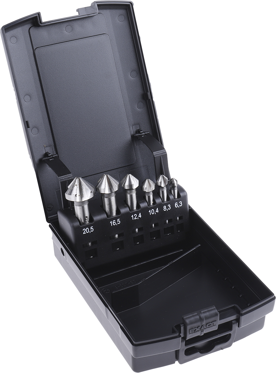 Zestaw rozwiertaków EXACT śr. głowicy: 6.3 mm, 8.3 mm, 10.4 mm, 12.4 mm, 16.5 mm, 20.5 mm kąt: 90° l. żłobków: 3 HSS