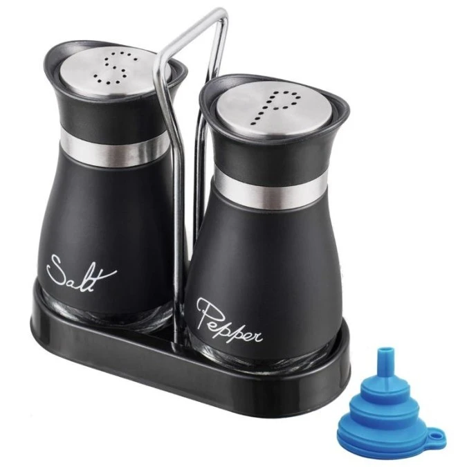 Solniczka pieprzniczka zestaw czarny szklany z podstawką stal nierdzewna