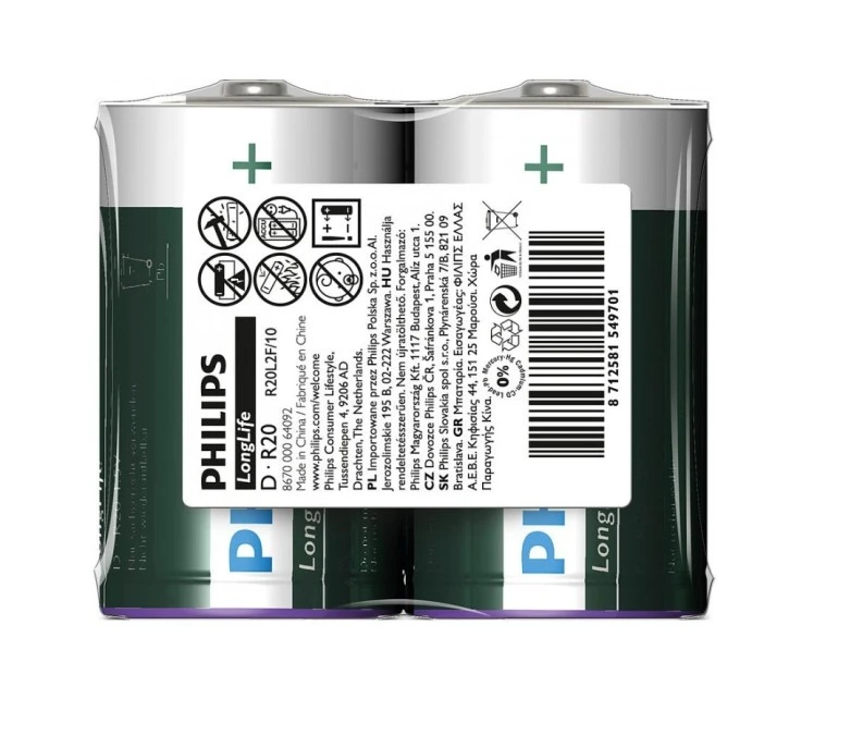 1. Bateria cynkowo-węglowa R20 / D 1,5V LongLife R20L2F/10 /tacka 2szt./ 9.82