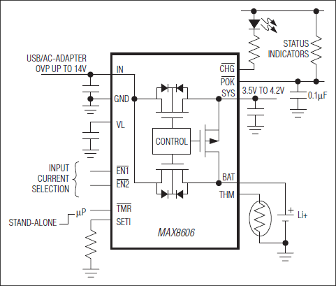 USB/AC Adapter, Li+ Linear Battery Charger with Integrated 50mΩ Battery Switch in TDFN