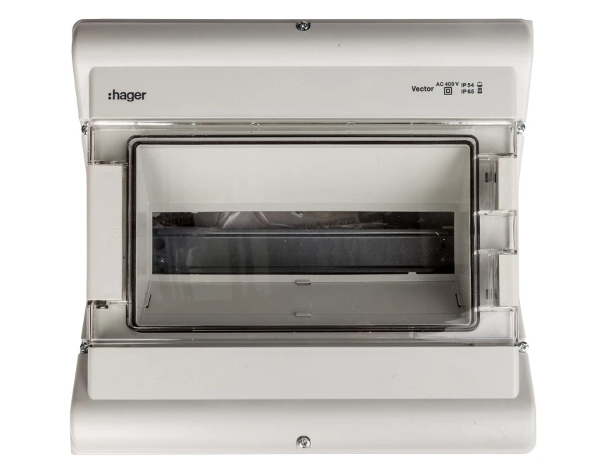 5. Rozdzielnica hermetyczna natynkowa 12 modułowa 1x12M drzwi transparentne IP65 vector II VE112L HAGER 211.19